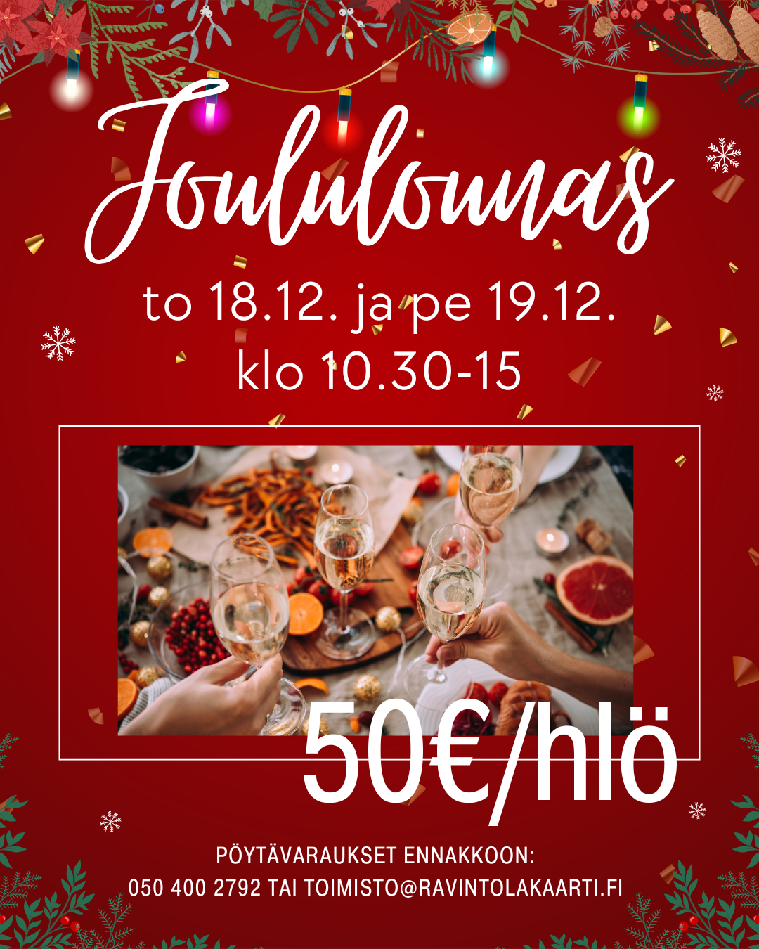 Järjestämme erityisen joululounaan torstaina 18.12. sekä perjantaina 19.12. klo 10.30-15. Tarjolla ei ole normaalia lounasta. Joululounaan hinta on 50€/hlö, lapset alle 12v. 1€/ikävuosi
